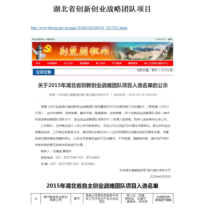 2016年4月,公司奧美沙坦原料藥配套中間體工藝開發(fā)及產(chǎn)業(yè)化項(xiàng)目成功入選2015年湖北省自主創(chuàng)業(yè)戰(zhàn)略團(tuán)隊(duì)項(xiàng)目名單,可獲得政府創(chuàng)業(yè)資金扶持。